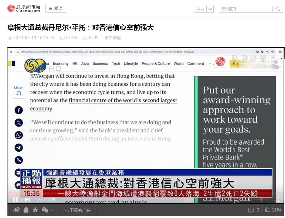 日前,摩根大通總裁丹尼爾·平托(Daniel Pinto)表示將繼續投資香港,相信香港可以在經濟週期轉向時走向復甦,並發揮其作為全球第二大國際金融中心的潛力。平托亦強調,摩根大通會繼續發展在港業務。他說,我們對香港的信心從來沒有像今天那麼強大,我們對香港,也是一百年不變。